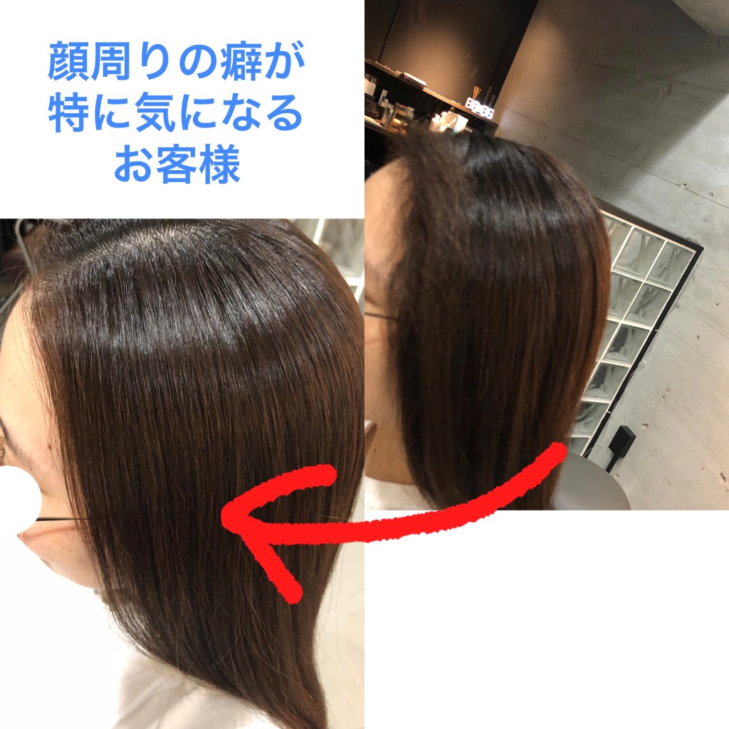 出産を期に顔まわりの髪に癖が出るようになったお客様で、お二人目出産前に手入れをしやすくする為に初めての縮毛矯正に来店されました。